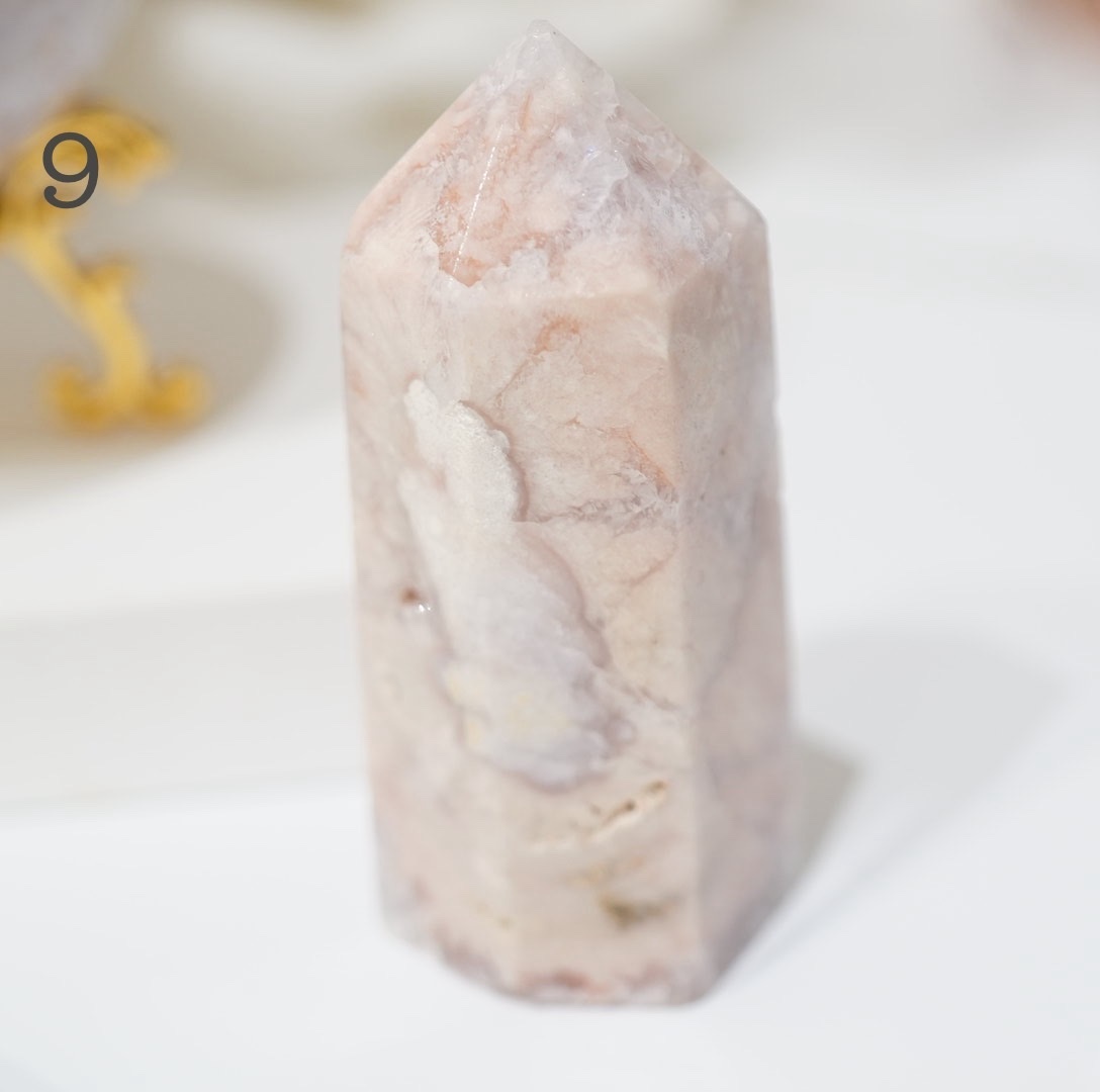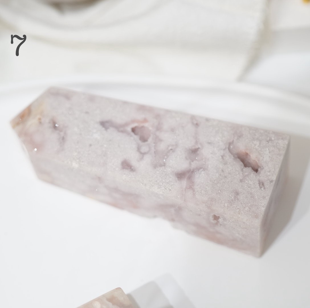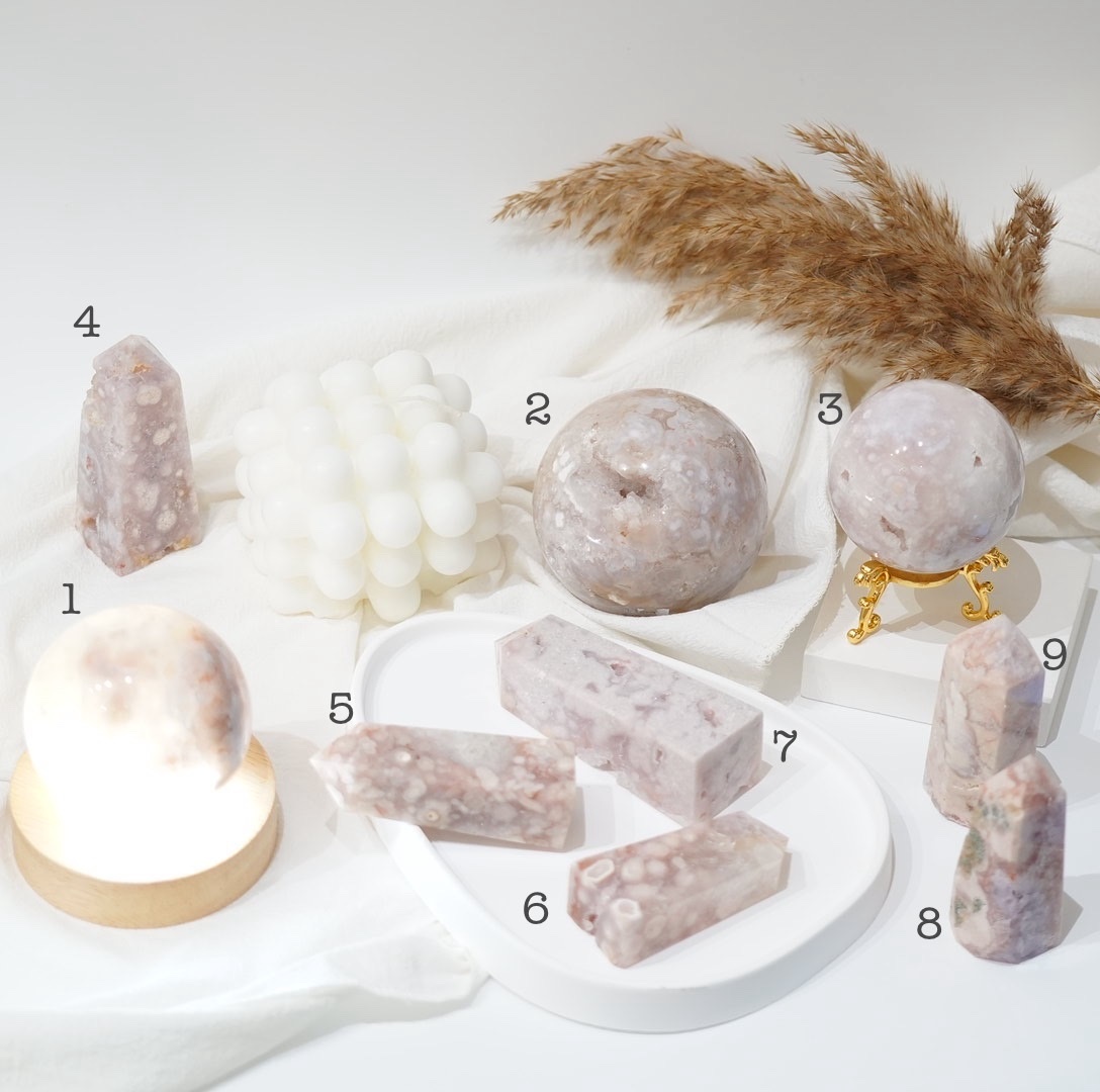 櫻花瑪瑙的結晶體就像朵朵盛開的小櫻花,每顆內部的結晶都是獨一無二的,散發出自然的溫柔和力量。櫻花瑪瑙常見顏色有橘粉色、橘色和豆沙色,有時還伴隨白色、紅色、綠色和粉色的共生礦~綠色的共生礦比較稀有特別,但外觀不一定符合每個人的喜好。所以,選擇自己喜愛、合眼緣的顏色才是最重要的,畢竟,每一顆水晶都是專屬的獨特的存在。