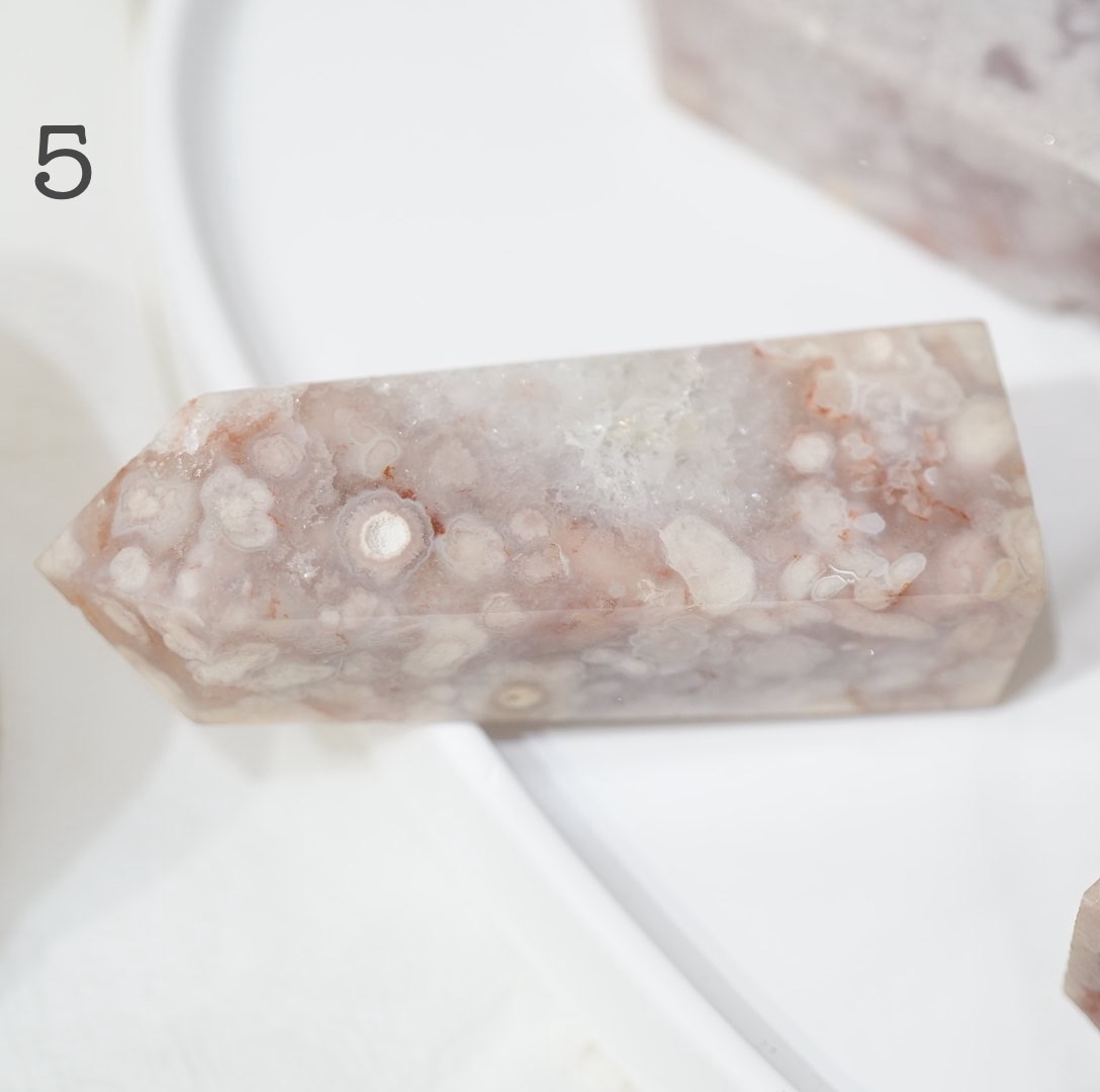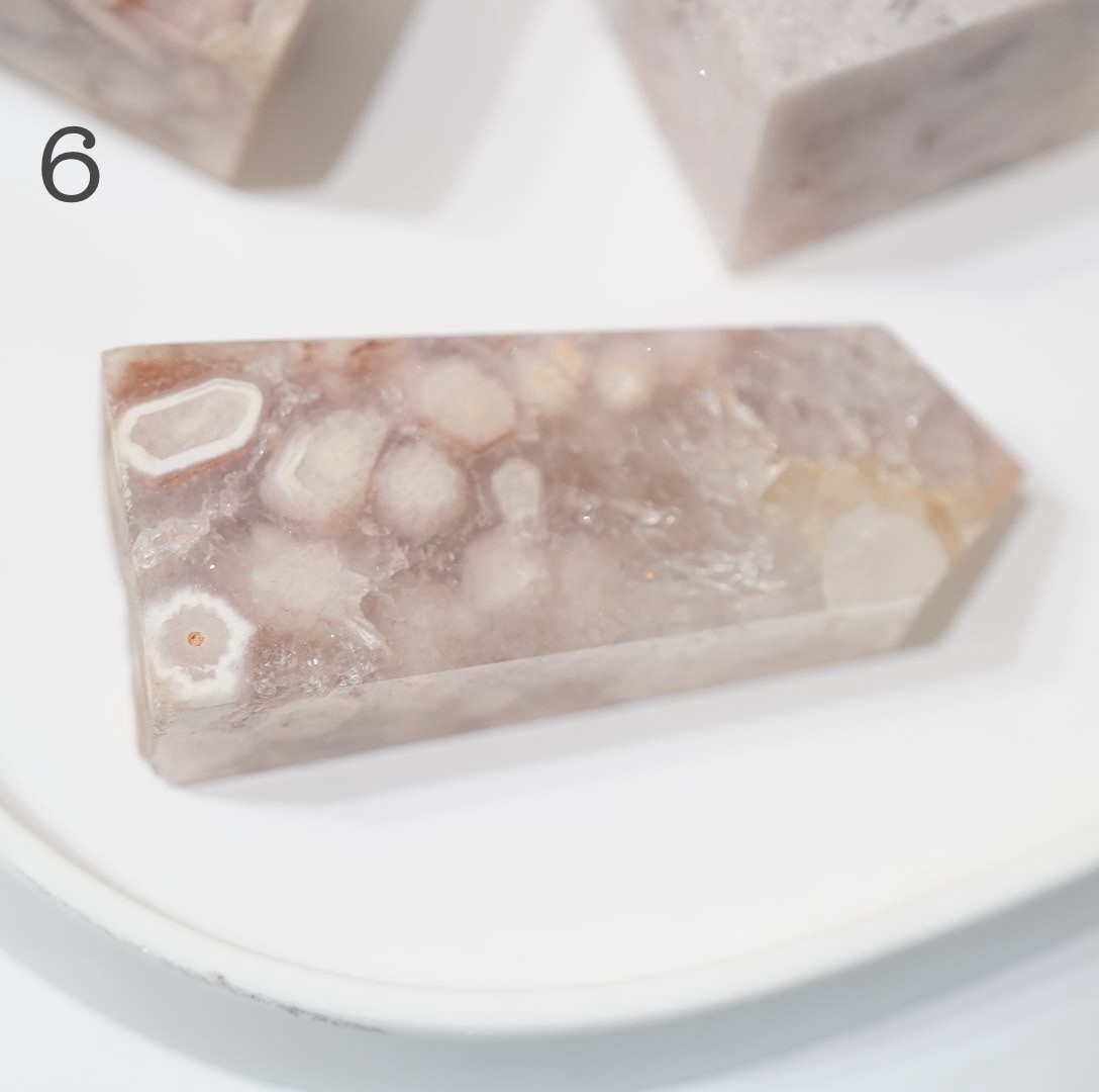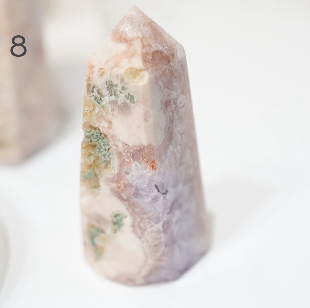 櫻花瑪瑙的結晶體就像朵朵盛開的小櫻花,每顆內部的結晶都是獨一無二的,散發出自然的溫柔和力量。櫻花瑪瑙常見顏色有橘粉色、橘色和豆沙色,有時還伴隨白色、紅色、綠色和粉色的共生礦~綠色的共生礦比較稀有特別,但外觀不一定符合每個人的喜好。所以,選擇自己喜愛、合眼緣的顏色才是最重要的,畢竟,每一顆水晶都是專屬的獨特的存在。